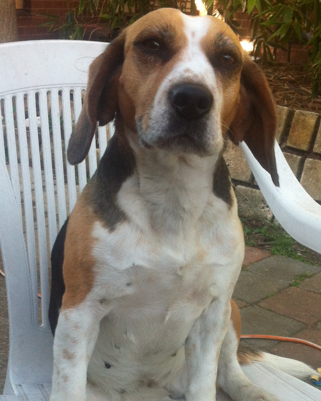 A 3 año(s), 9 mes(es) y 0 día(s), SYBELLE, Beagle hembra , pesado 14.3 kg.