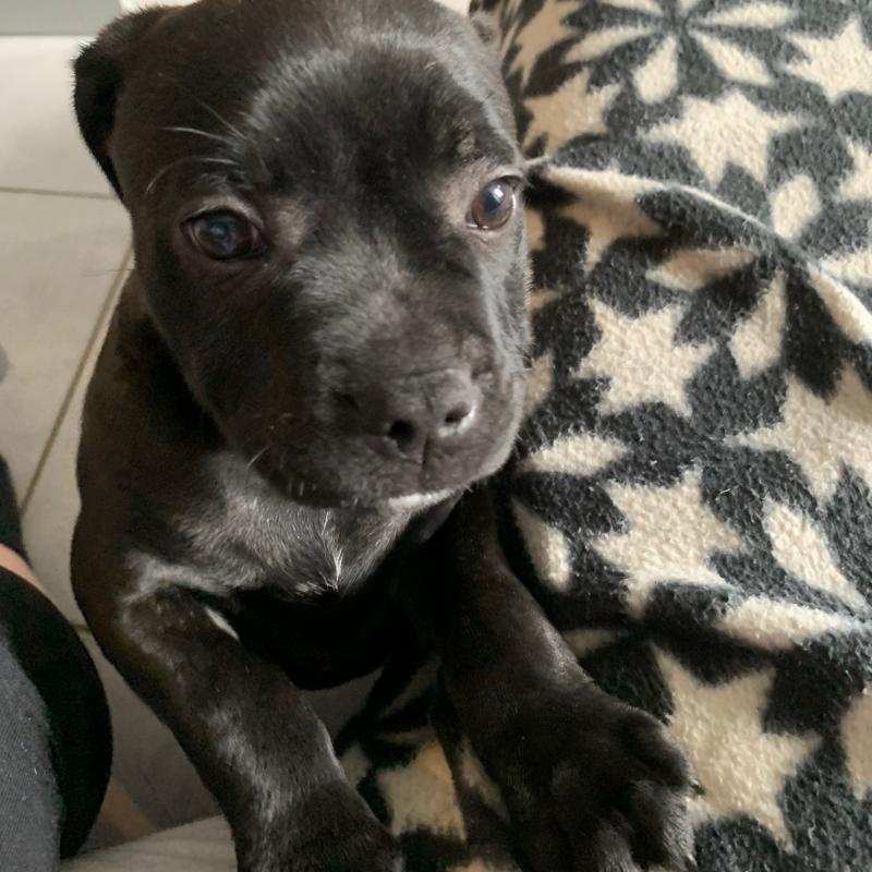 A 0 año(s), 6 mes(es) y 28 día(s), Paupiette, Staffordshire Bull Terrier masculino , pesado 19 kg.