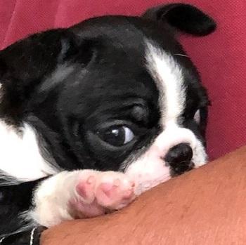 A 0 año(s), 3 mes(es) y 27 día(s), Frida Kahlo, Boston Terrier hembra , pesado 3.45 kg.