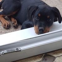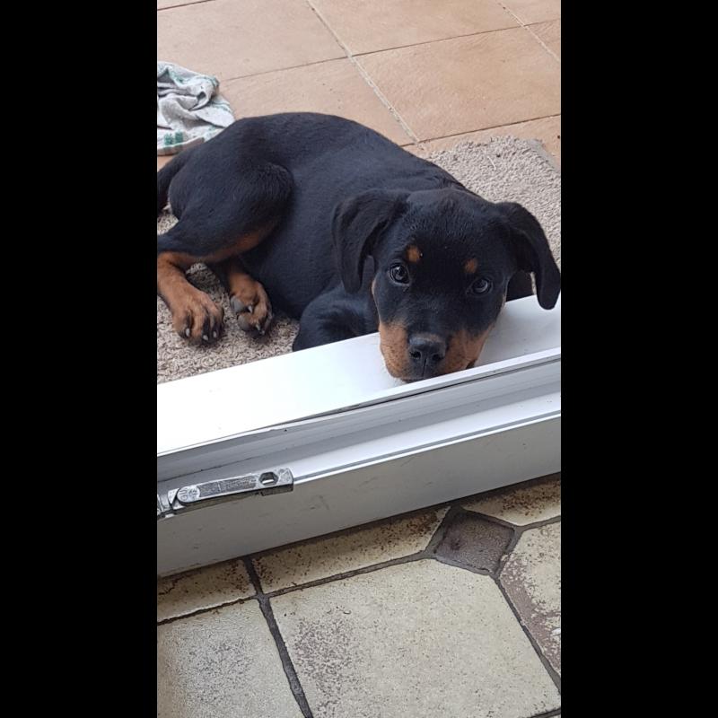 A 0 año(s), 3 mes(es) y 23 día(s), Arko, Rottweiler masculino , pesado 18.5 kg.