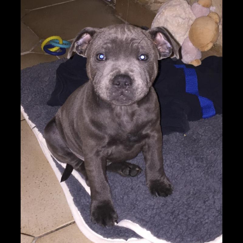 A 0 año(s), 6 mes(es) y 28 día(s), Paupiette, Staffordshire Bull Terrier masculino , pesado 19 kg.