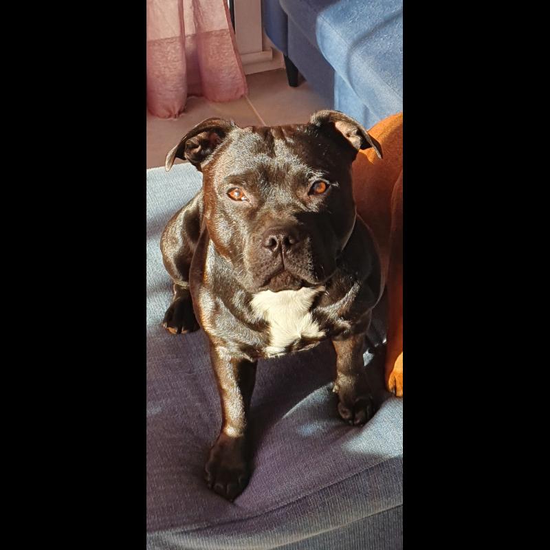 A 1 año(s), 9 mes(es) y 17 día(s), Léon, Staffordshire Bull Terrier masculino , pesado 16.5 kg.