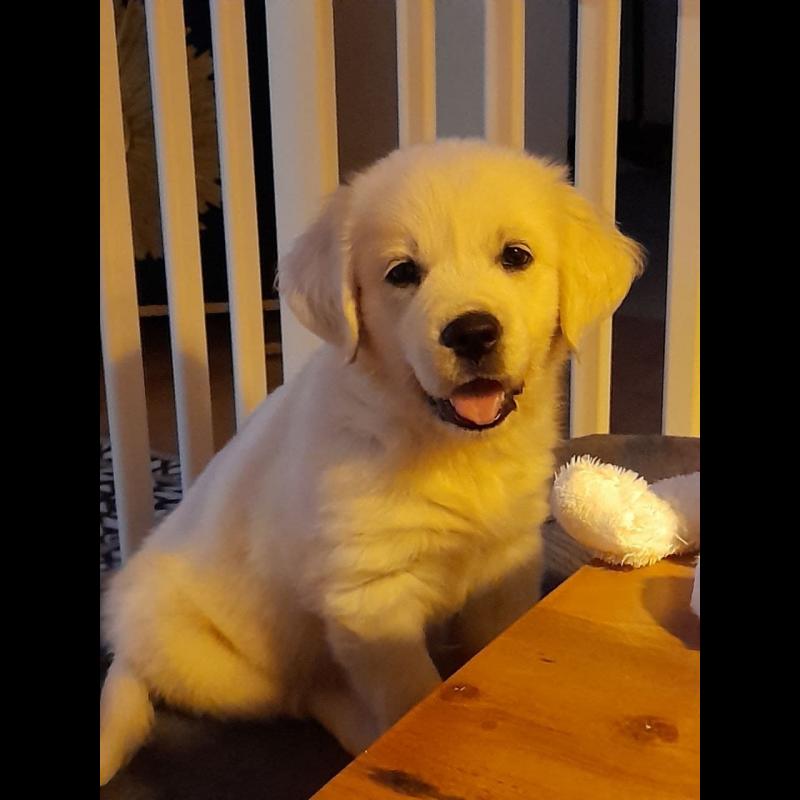 A 0 año(s), 5 mes(es) y 28 día(s), Yuna, Golden Retriever hembra , pesado 17.7 kg.