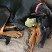 A 0 año(s), 4 mes(es) y 26 día(s), Merlot, Dóbermann hembra , pesado 24.9 kg.
