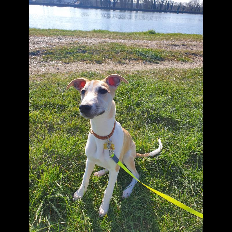 A 1 año(s), 0 mes(es) y 12 día(s), Bambi, Whippet masculino , pesado 11.4 kg.